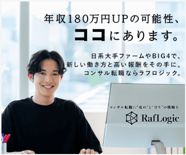 RafLogic(ラフロジック)では、「より条件の良い環境で働きたい」「年収を上げたい」「将来的に市場価値を高めたい」という志向を持つ方に向けて、年収アップが期待できるコンサル求人を中心に取り扱っています。若手から中堅、シニア層まで幅広く対応し、キャリアステージに応じた最適なポジションを提案することで、短期的な年収向上だけでなく、中長期的なキャリア形成も視野に入れた転職を可能にします。